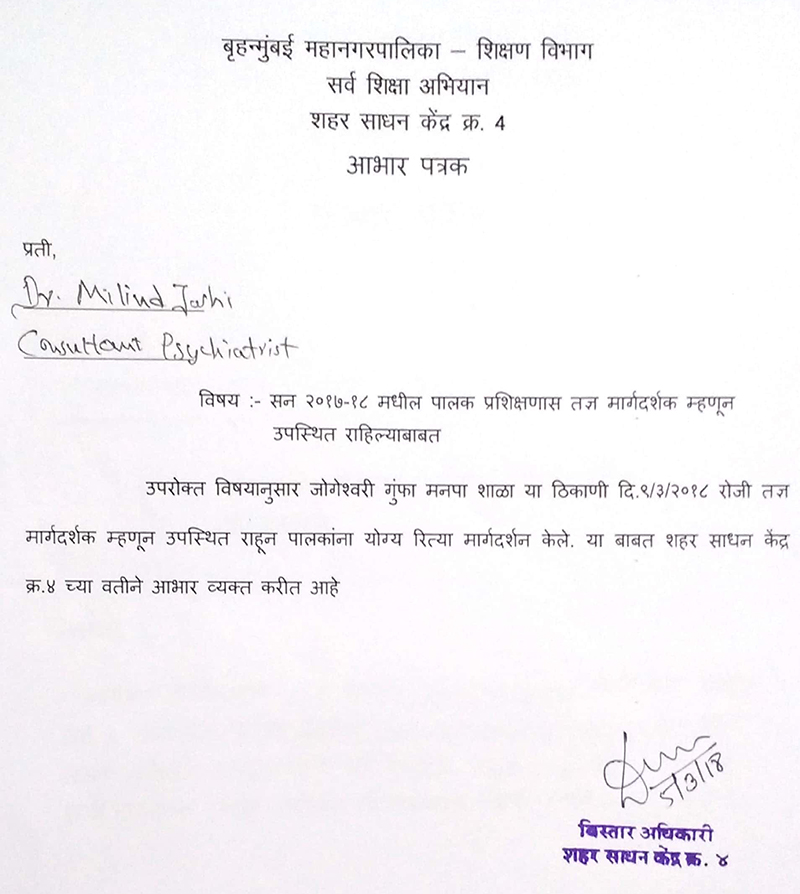 Training program on Learning Disorders at URC (Urban Resource Center) No. 4 of Jogeshwari BMC School on 9/3/18 for parents and teachers.